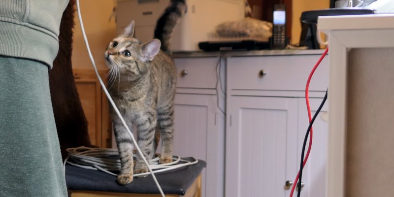 Meine Zweibeiner spielten nämlich mit einem seeeehr langen Kabel. Aber nicht einfach so – nein! Das war hochkonzentriertes, wichtig aussehendes Arbe...